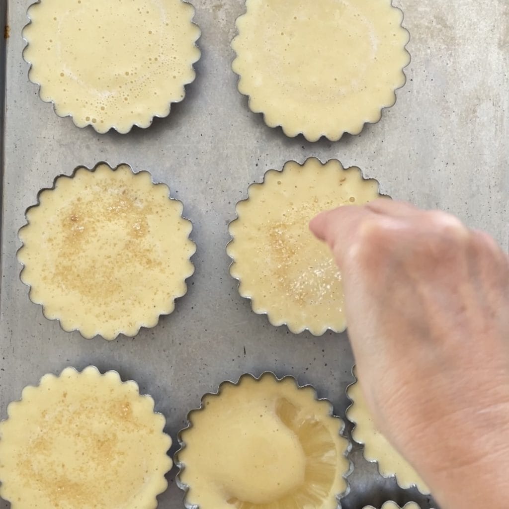• Plaats de vormpjes op de bakplaat en bestrooi ze met rietsuiker om later taartjes met een gekarameliseerd en goudbruin oppervlak te krijgen.