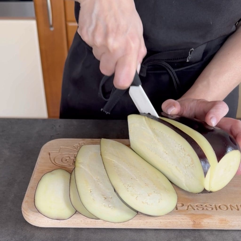 We beginnen met het bereiden van de Auberginerolletjes met ricotta, was de aubergine, verwijder de uiteinden en snijd in plakken van ongeveer 1 centimeter niet meer.