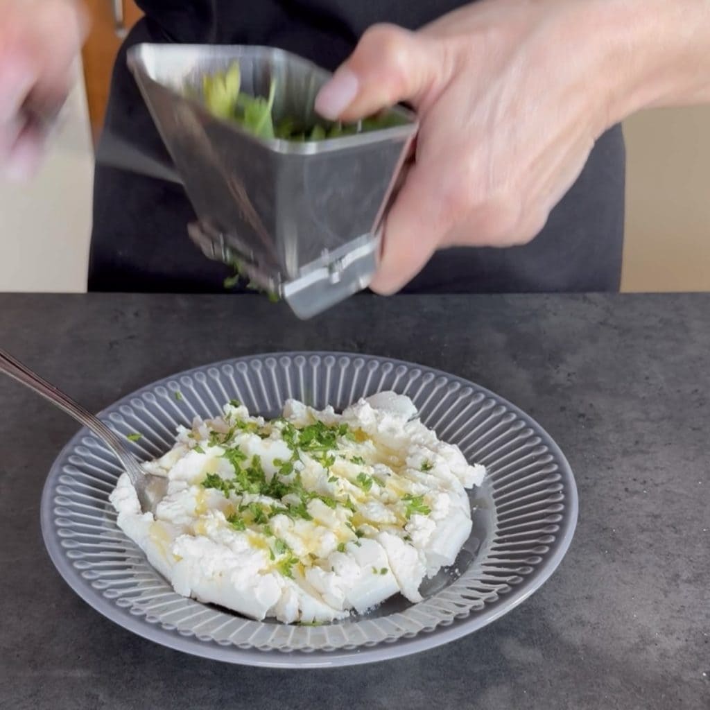 en een ruime hoeveelheid fijngehakte peterselie, meng alles goed en bewaar in de koelkast.