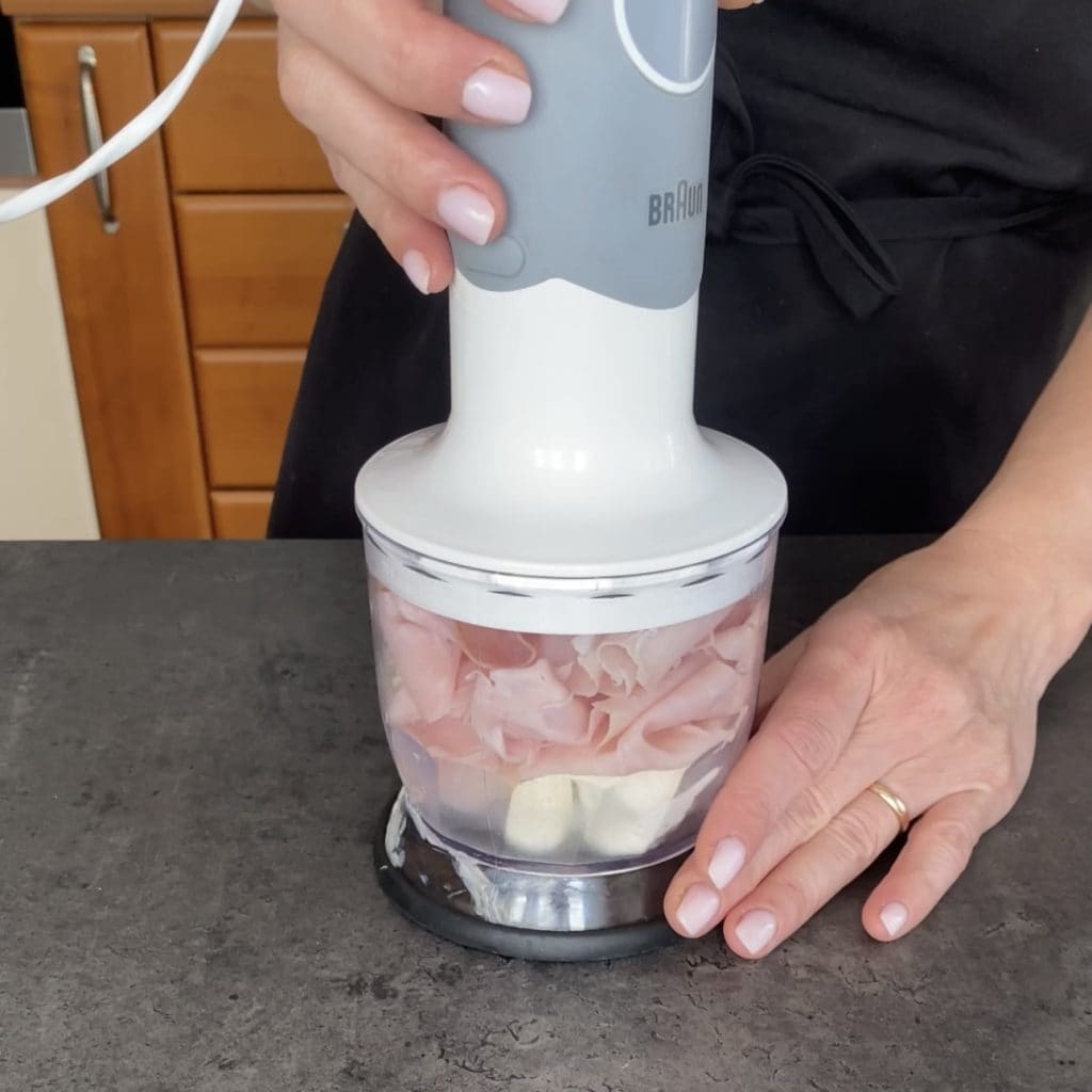 • Ondertussen doe je de smeerkaas en de gekookte ham in de blender en mix tot je een gladde crème krijgt.