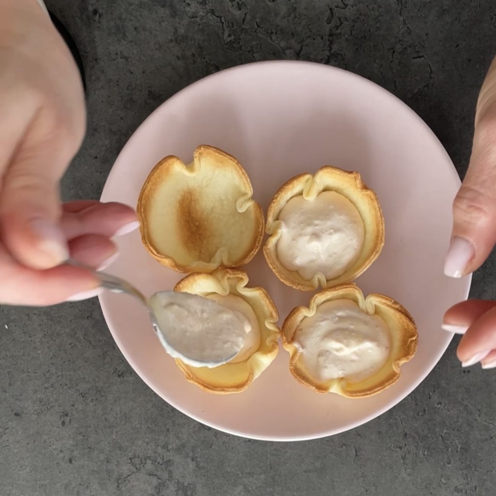 • Plaats de bakjes op een bord en vul ze met de hamcrème,