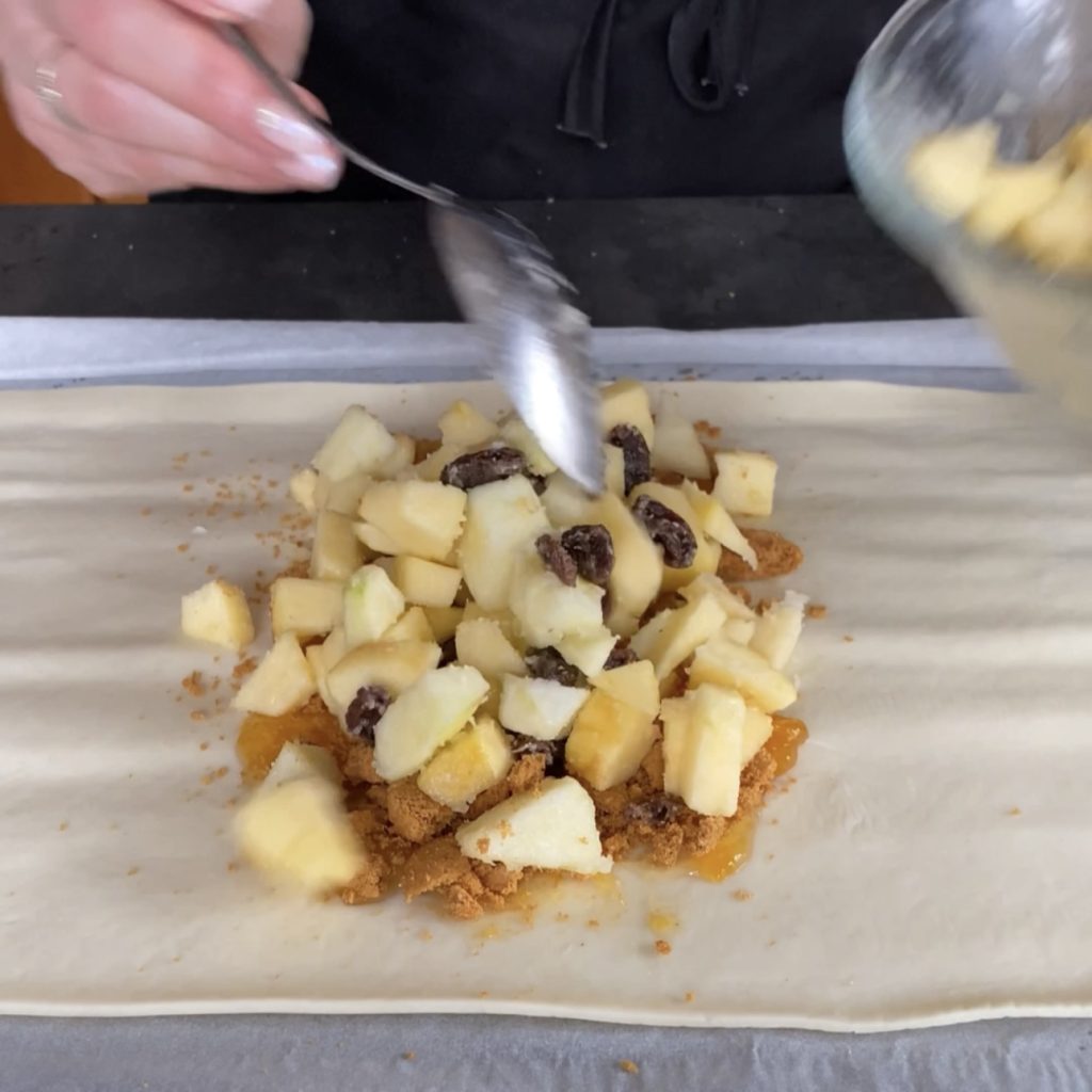 Rol het bladerdeeg uit, houd de lange kant naar je toe en plaats in het midden wat jam die je vervolgens uitsmeert,