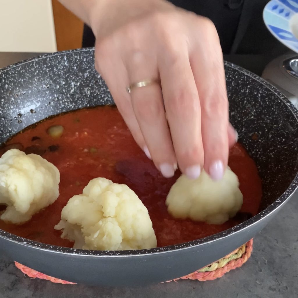 Met behulp van een lepel voeg je de saus toe aan de bloemkool, zet op het vuur en kook gedurende 10 minuten, als de saus te dik is, kun je een beetje water toevoegen.