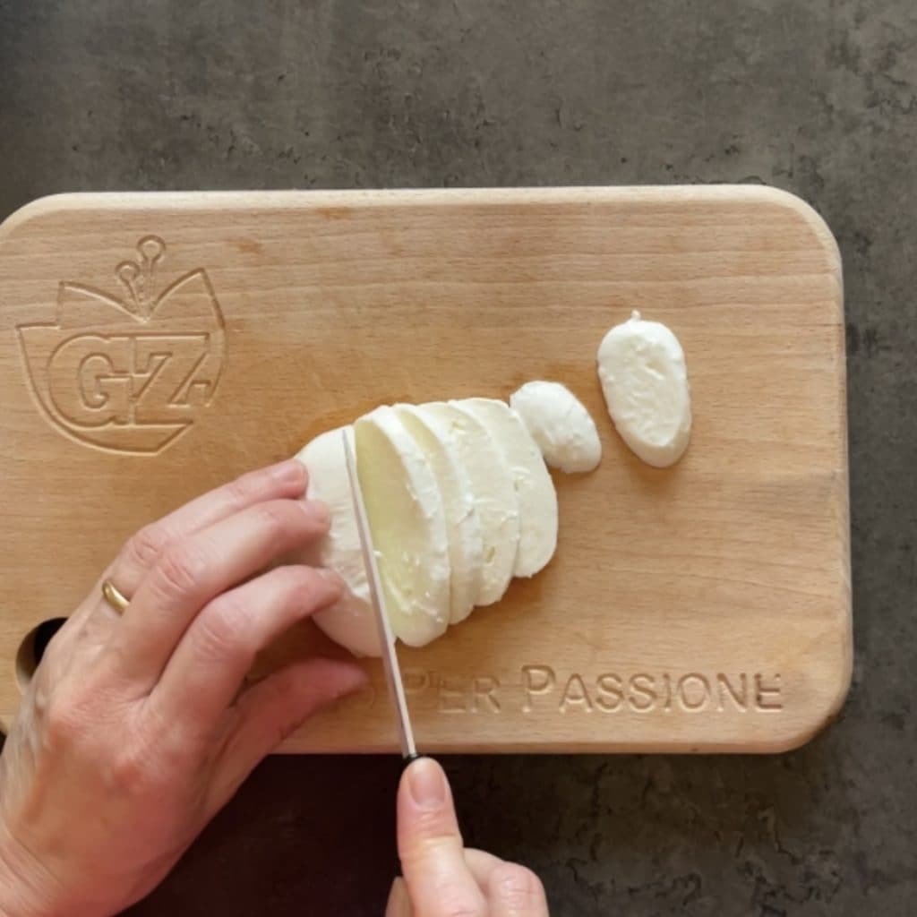 • We beginnen met het bereiden van de spiesjes met Carpaccio van rundvlees, snijd de mozzarella in dunne plakjes