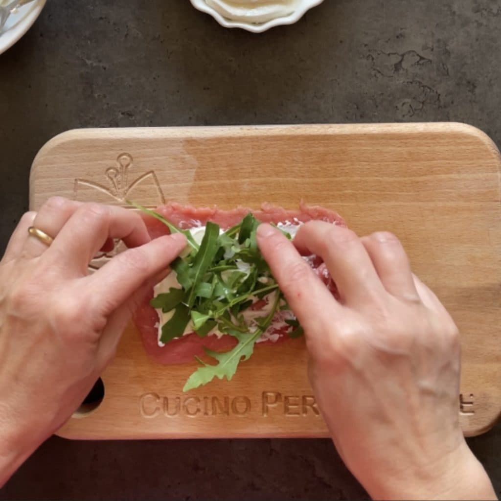 • Neem de plakjes carpaccio en smeer op elke plak wat smeerkaas