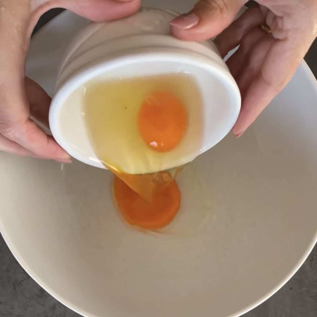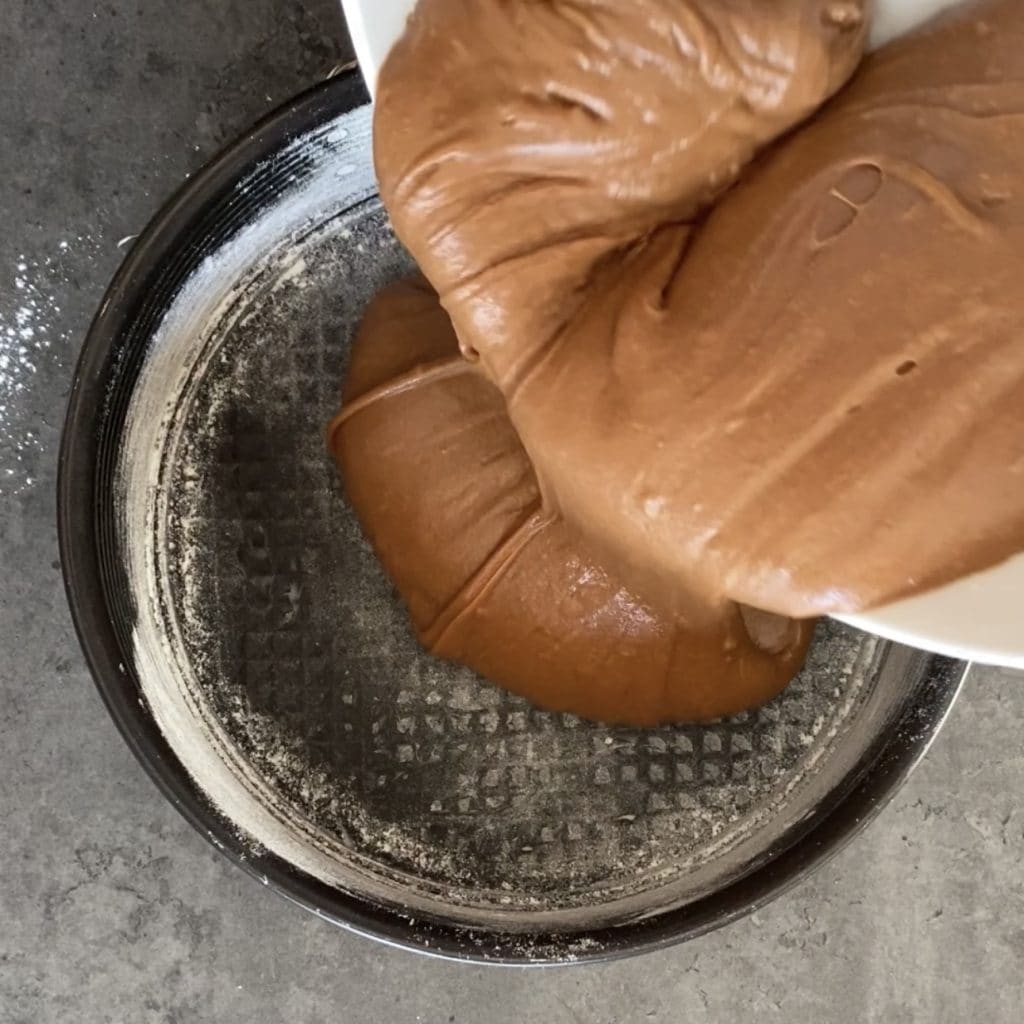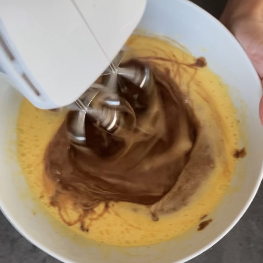 • Wanneer het mengsel homogeen is en de nutella goed in de eieren is opgenomen, voeg de gezeefde bakpoeder toe