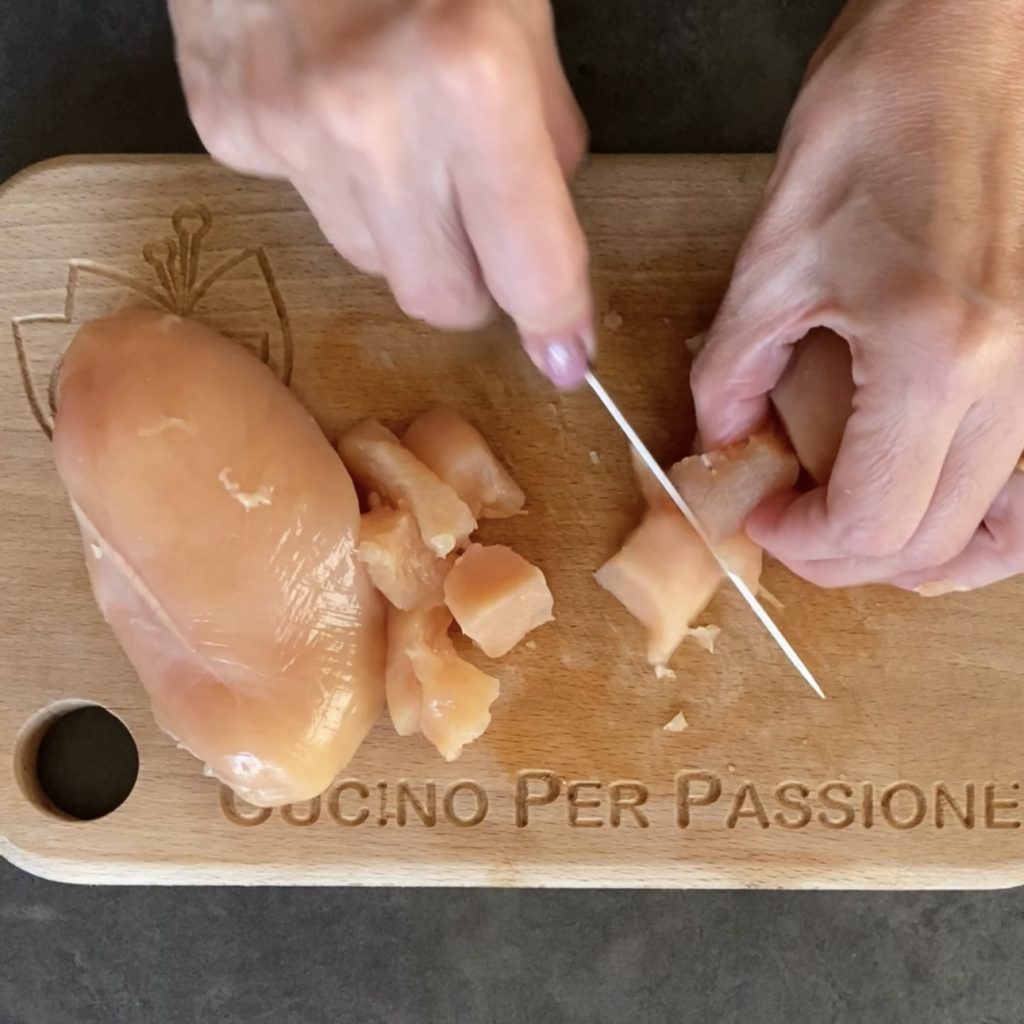 Verwijder eventuele botjes en vet van de kipfilet, snijd deze dan in stukjes