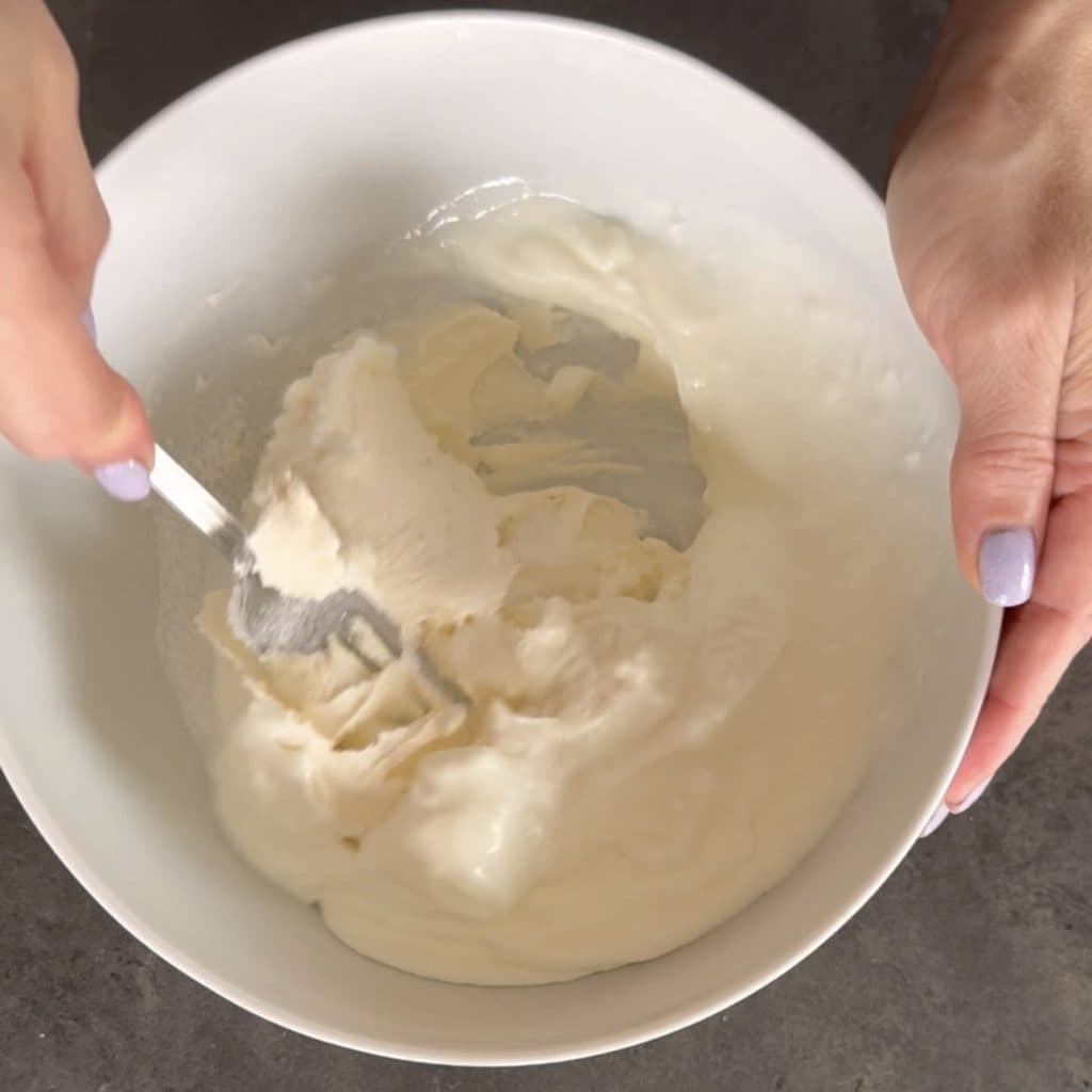 We beginnen met het bereiden van de Cocos- en yoghurttaart door de mascarpone in een kom te doen en te mengen met een vork,