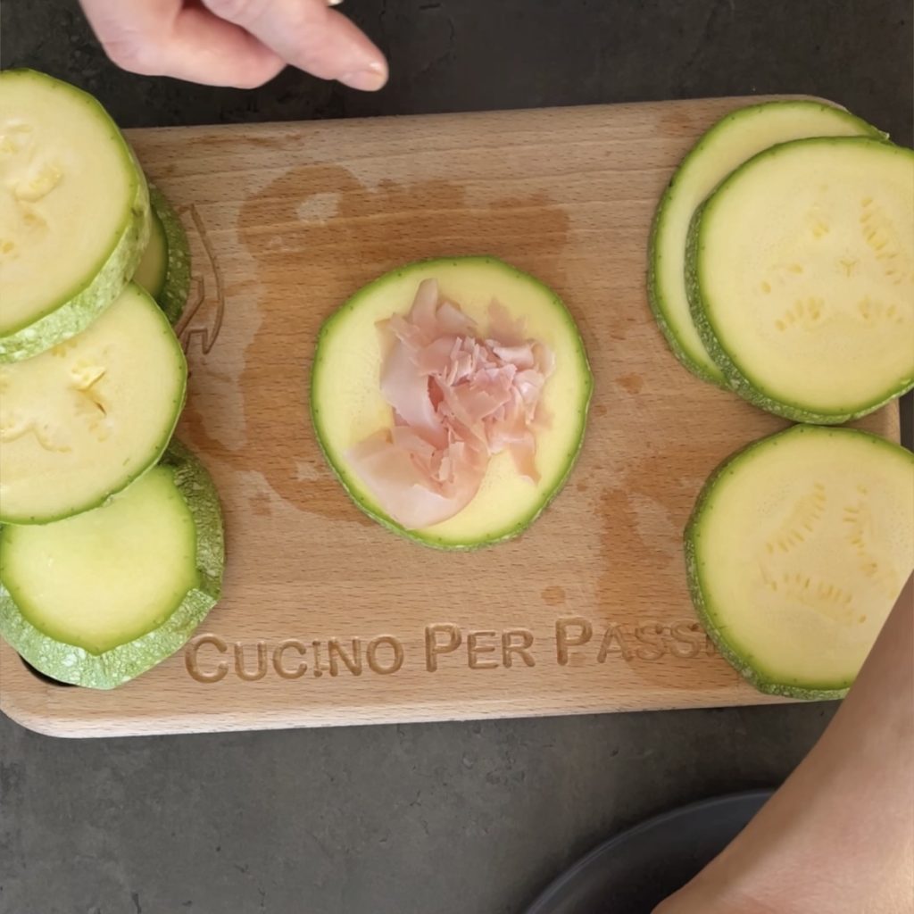Neem nu een plakje courgette en leg er een plakje gekookte ham in het midden op,