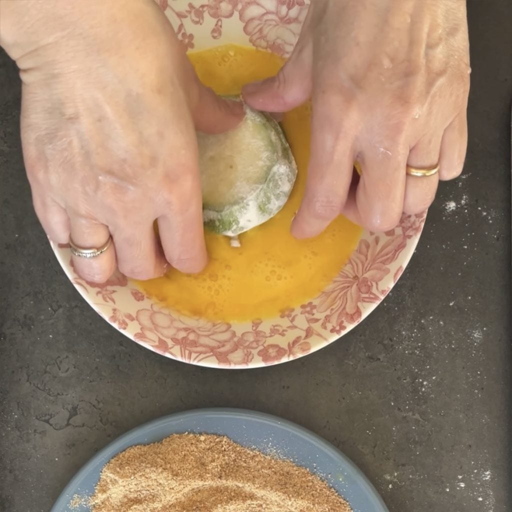 en door het paneermeel, dankzij deze dubbele coating krijg je krokante courgettes aan de buitenkant en zachte binnenin. Zorg ervoor dat je een goede paneerlaag maakt, zodat de courgettes goed verzegeld zijn en de kaas er niet uitloopt.