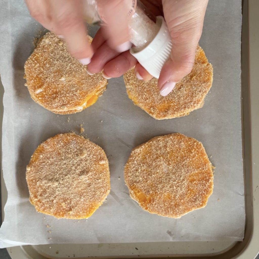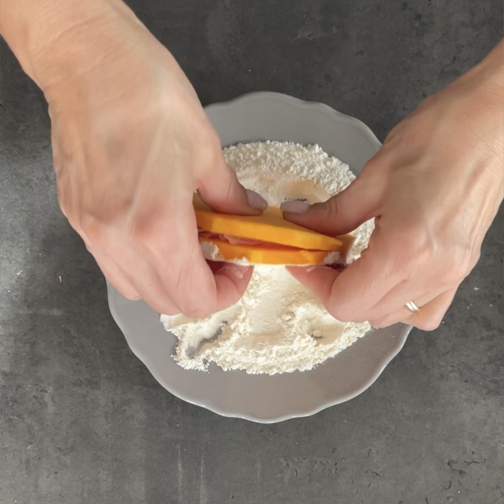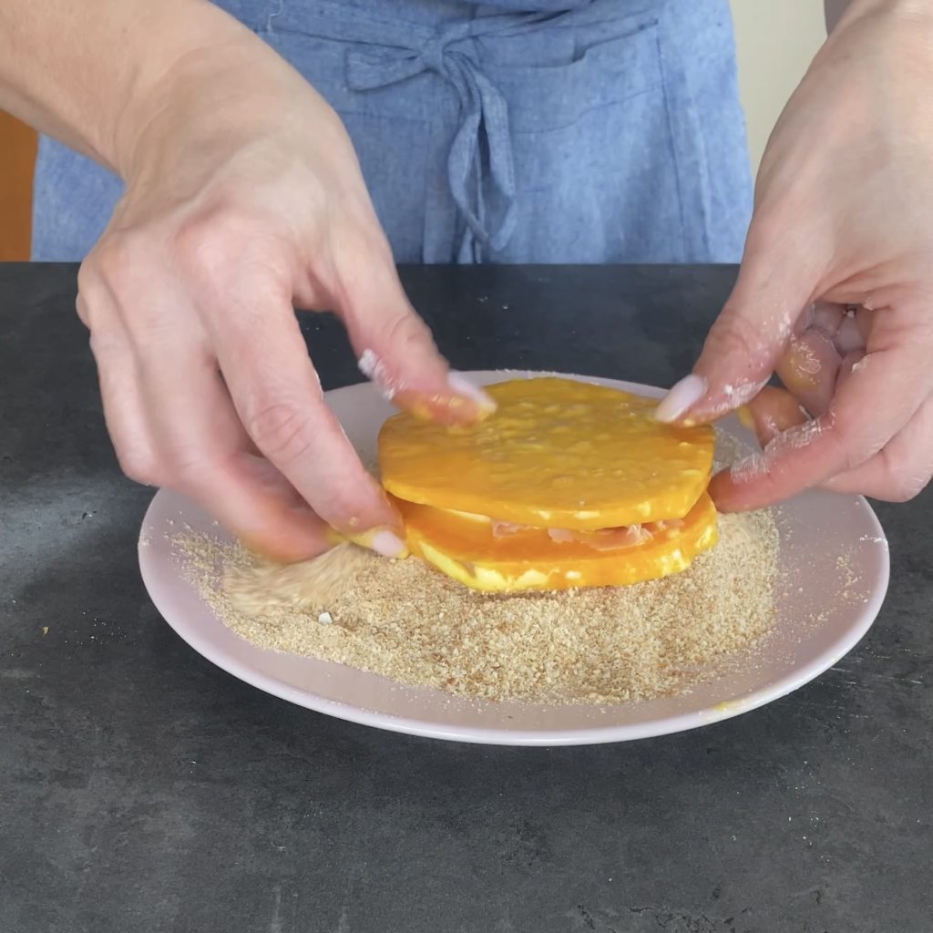 en sluit af met de tweede plak pompoen en druk goed aan. Ga op dezelfde manier verder voor de andere cordon bleu van pompoen.