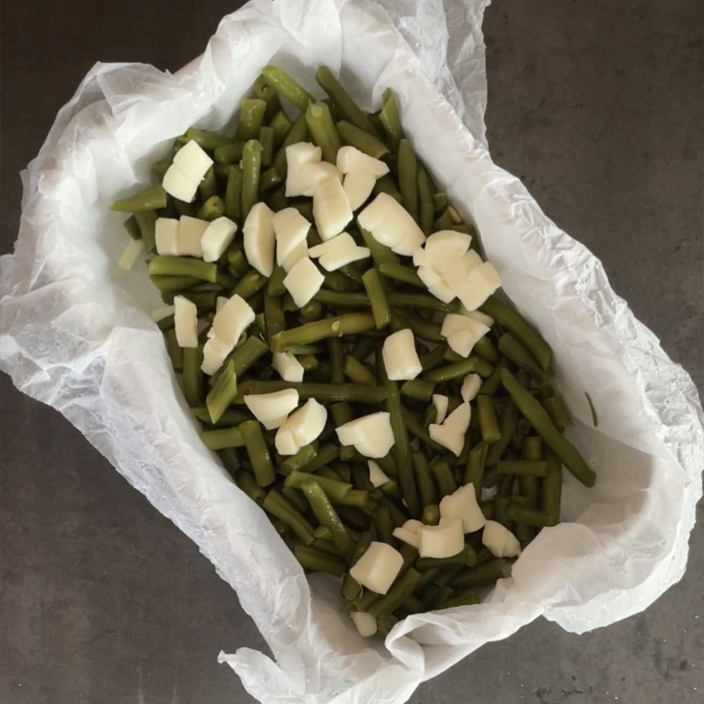 Als de sperziebonen zijn afgekoeld, snijd ze in kleine stukjes.
