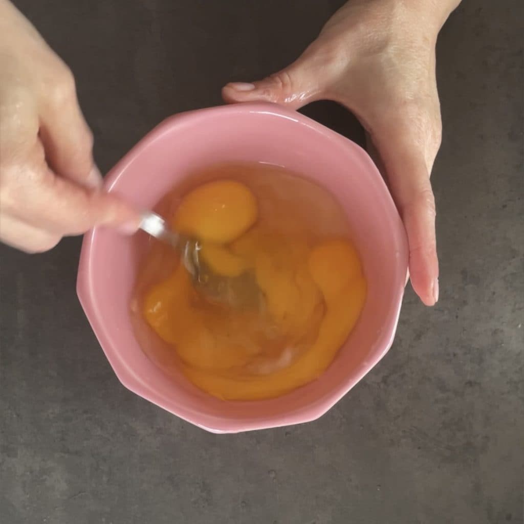 Bekleed een ovenschaal met bakpapier, als de schaal klein is wordt de frittata hoger, als hij groter is wordt hij lager. Giet de eieren met de sperziebonen en verdeel ze gelijkmatig over de hele schaal.