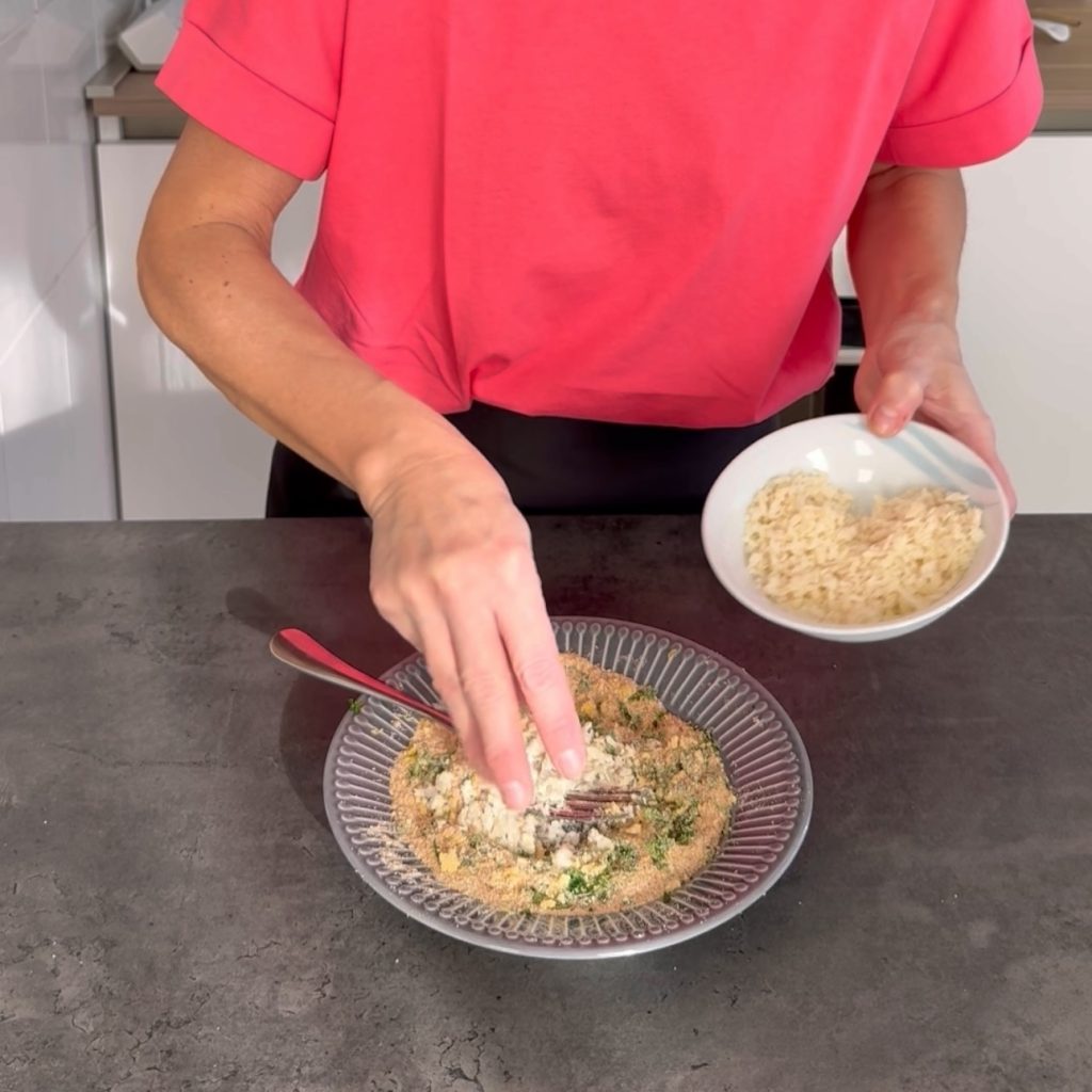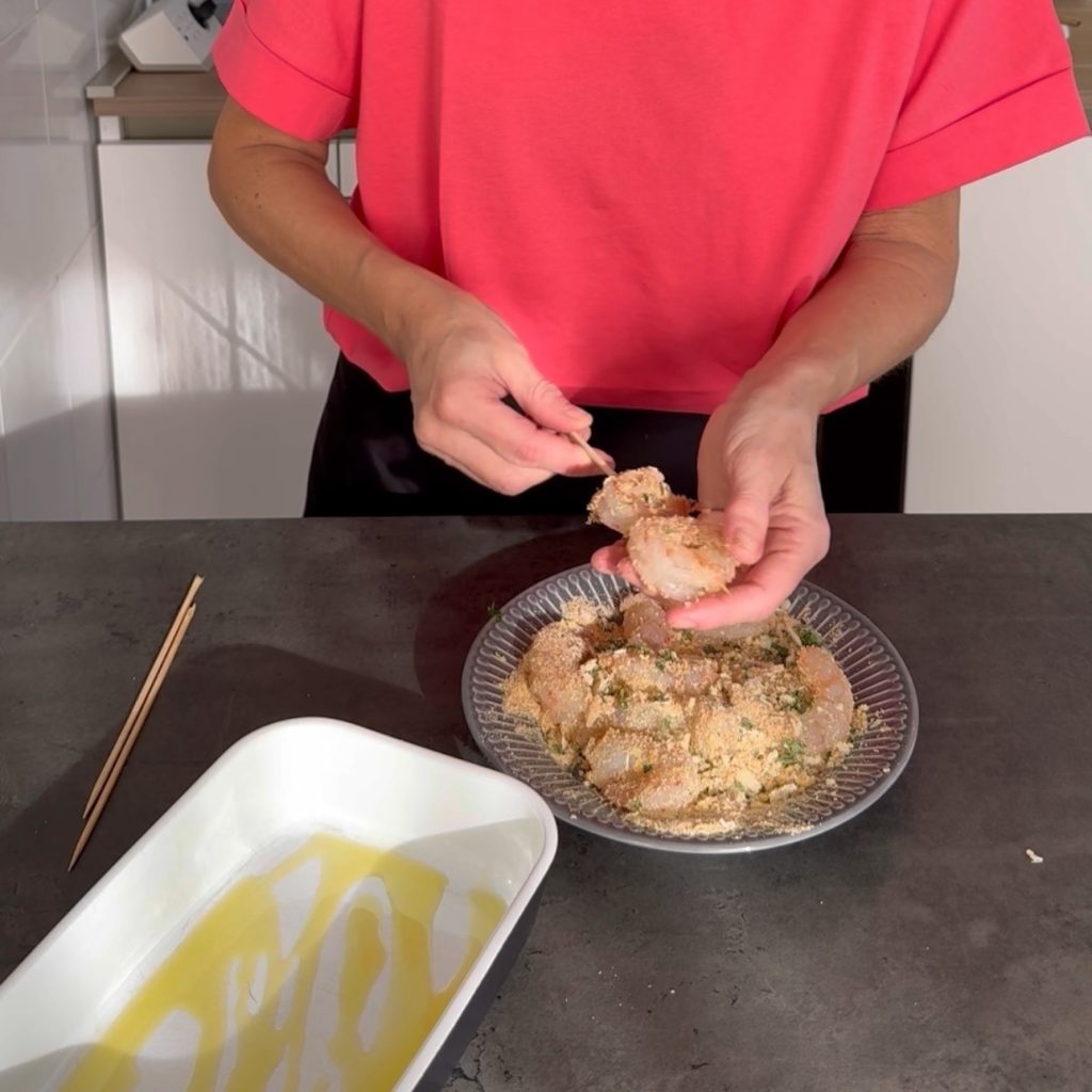 • Haal de eerder schoongemaakte garnalen door het paneermeel.