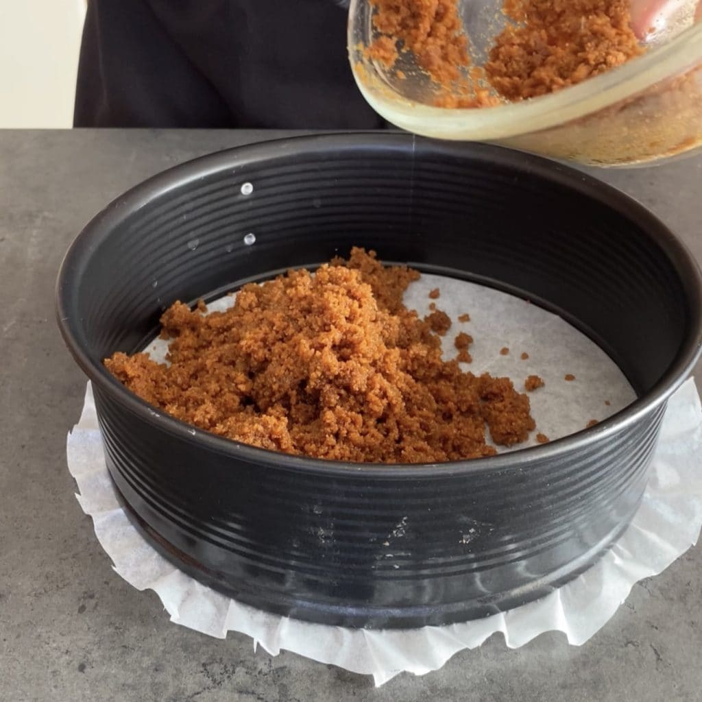 Bekleed de bodem van de taartvorm met bakpapier en giet de koekjes erover,