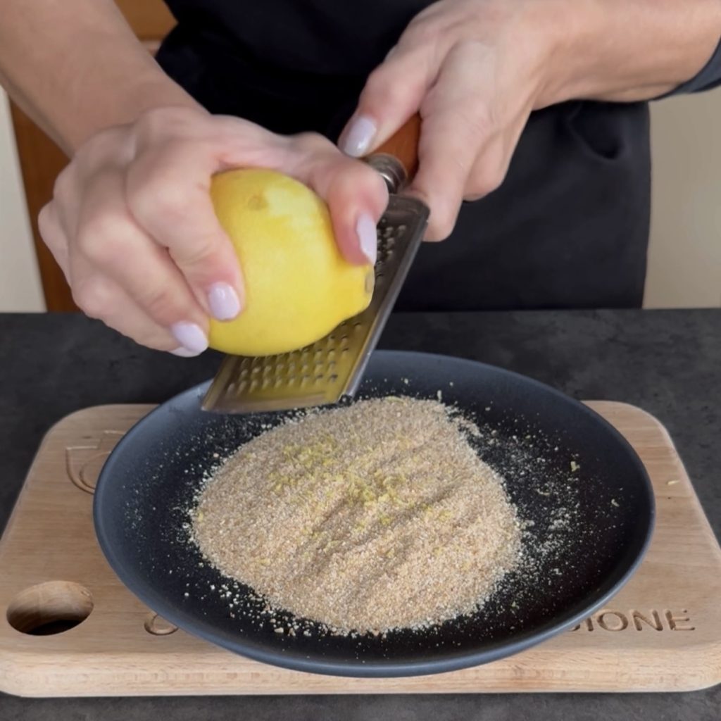 Giet het paneermeel in een bord, voeg de geraspte citroenschil toe