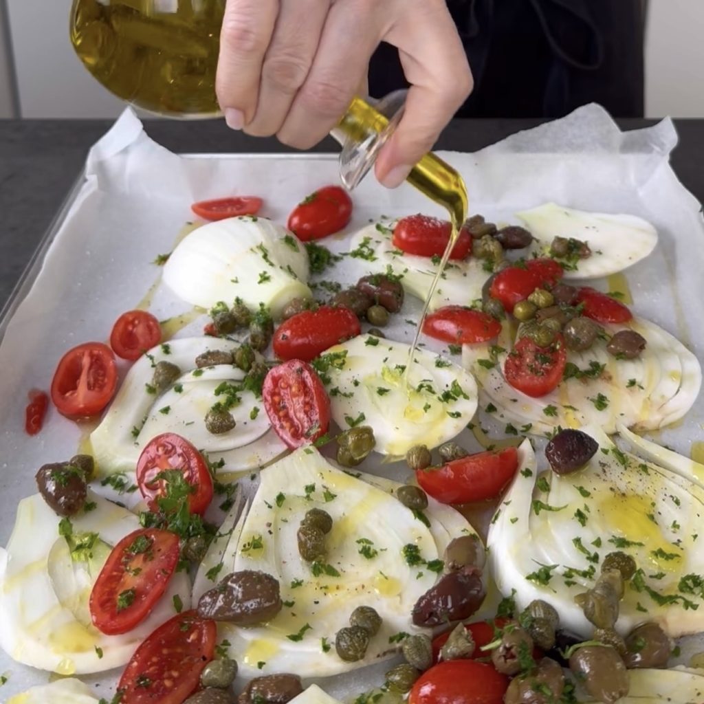 • GEBBAKKEN VENKEL met kerstomaatjes, olijven en kappertjes