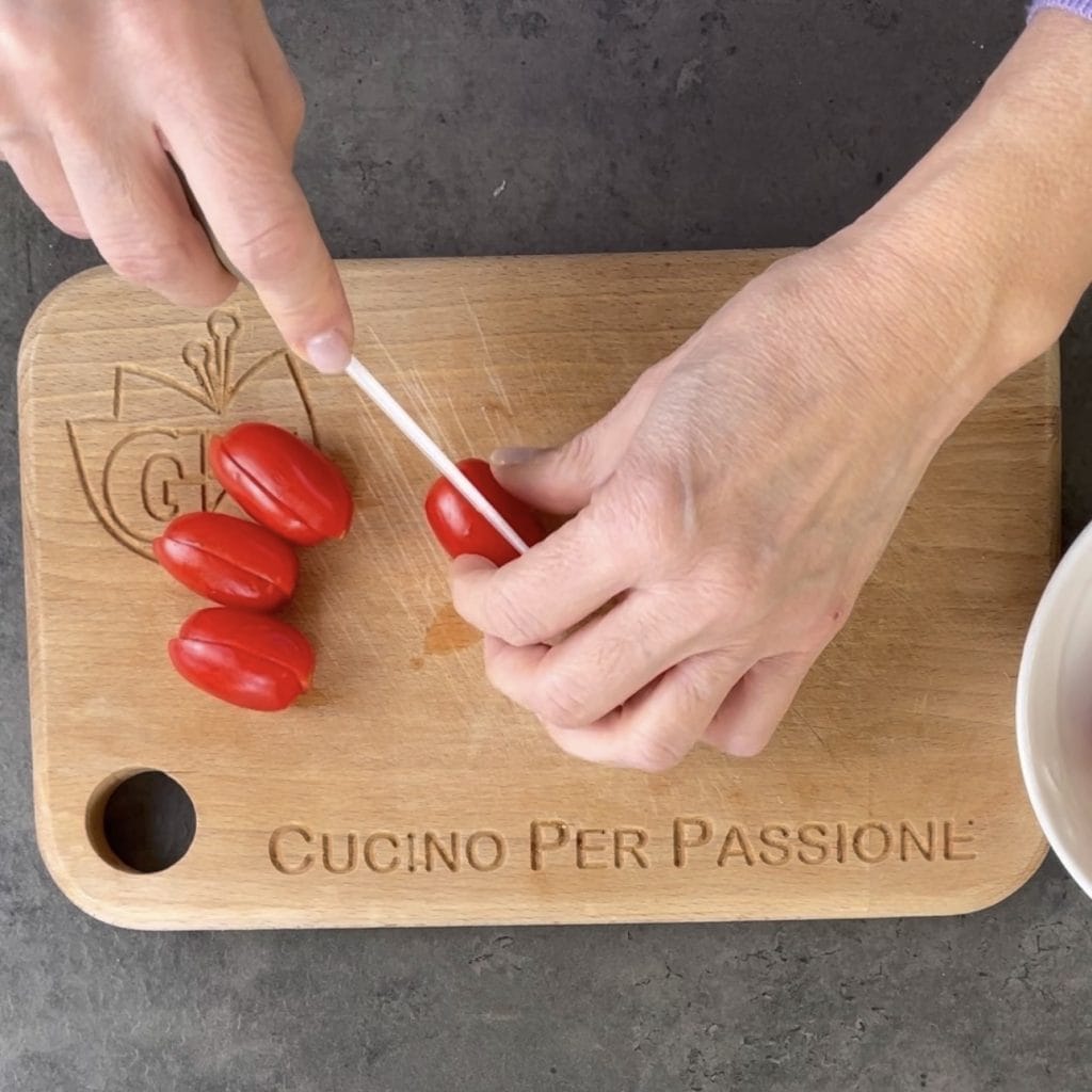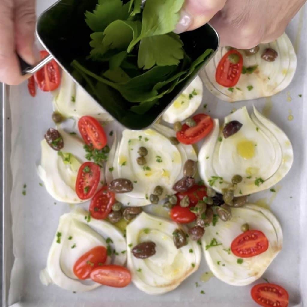 • We beginnen met het bereiden van de GEBBAKKEN VENKEL met kerstomaatjes, olijven en kappertjes. Maak de venkel schoon, was ze en snijd ze in plakken van ongeveer een halve centimeter.