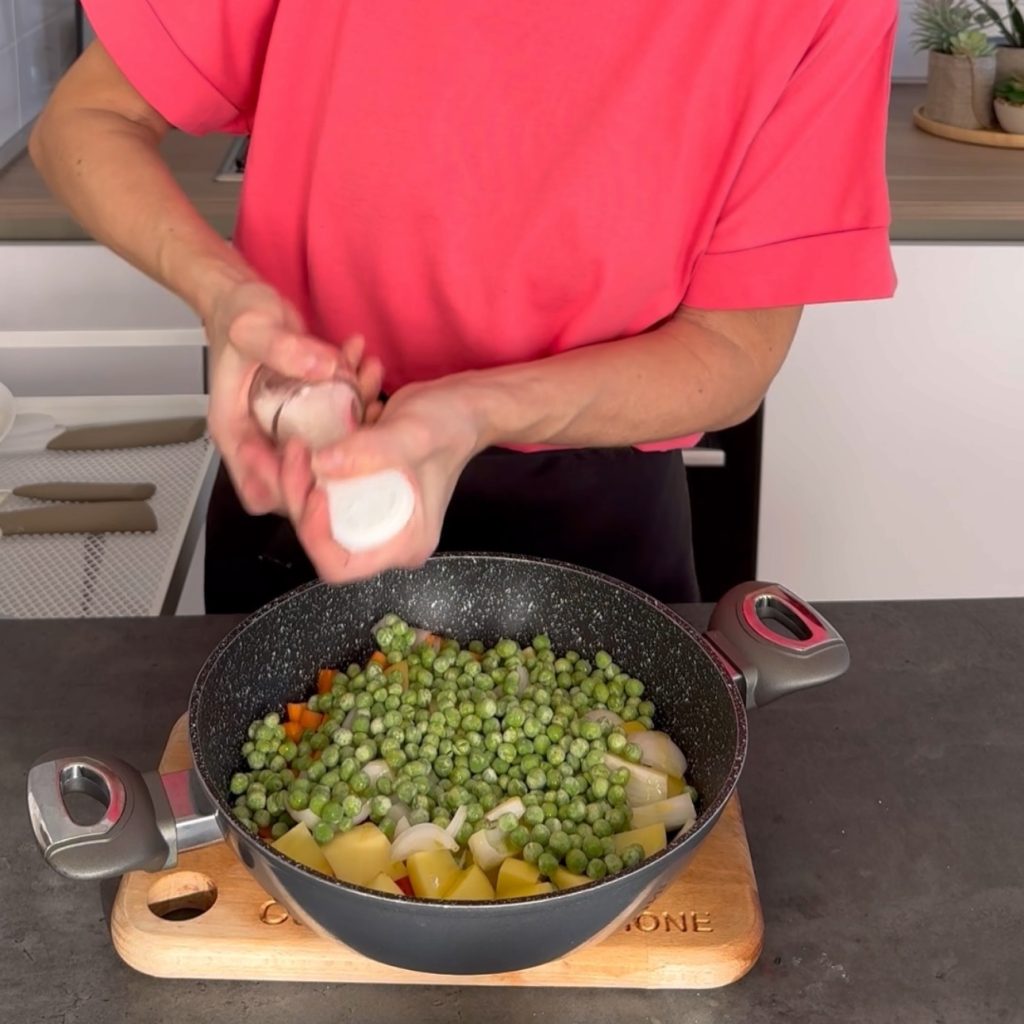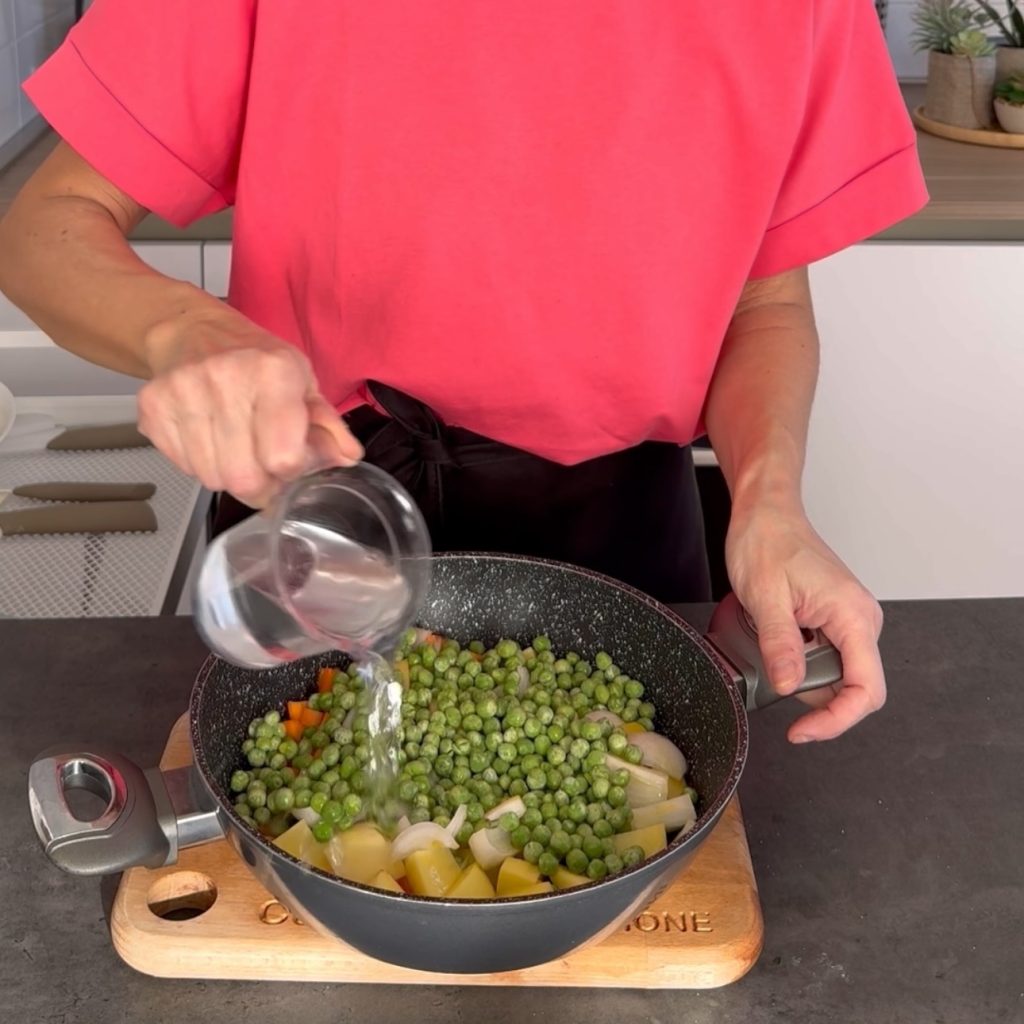en voeg de diepvries of verse erwtjes toe,