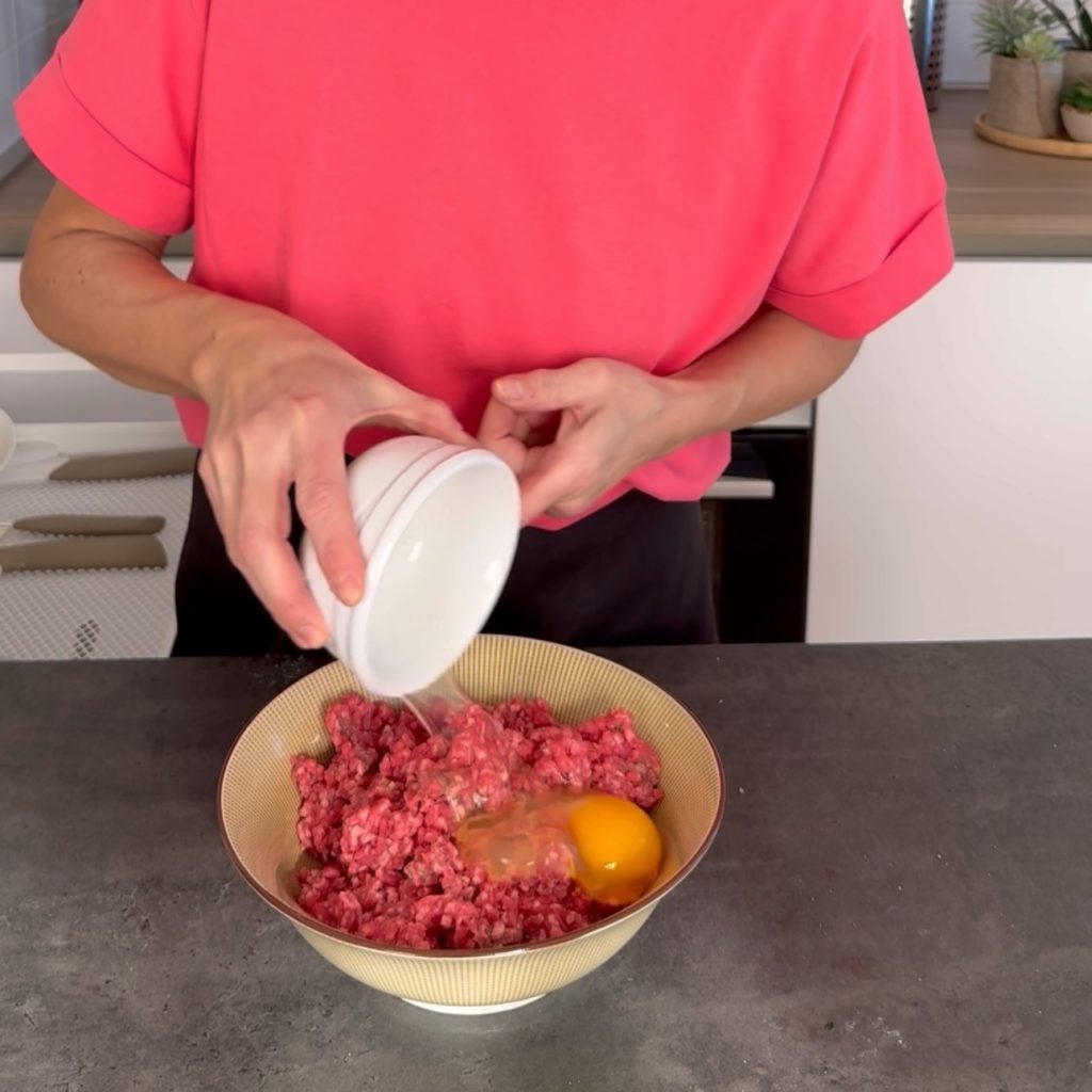 Doe het gehakt in een kom en voeg het ei toe,