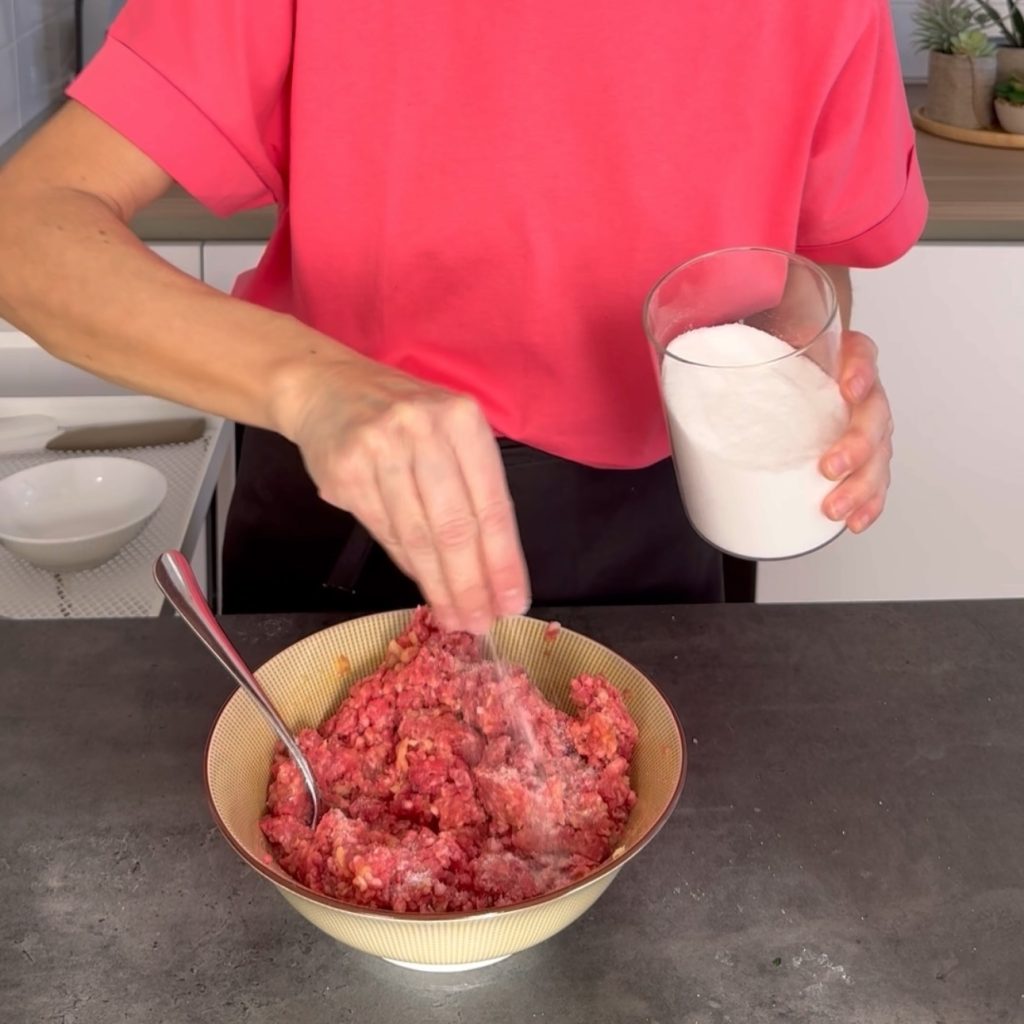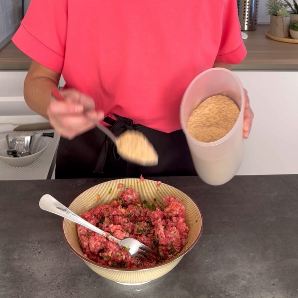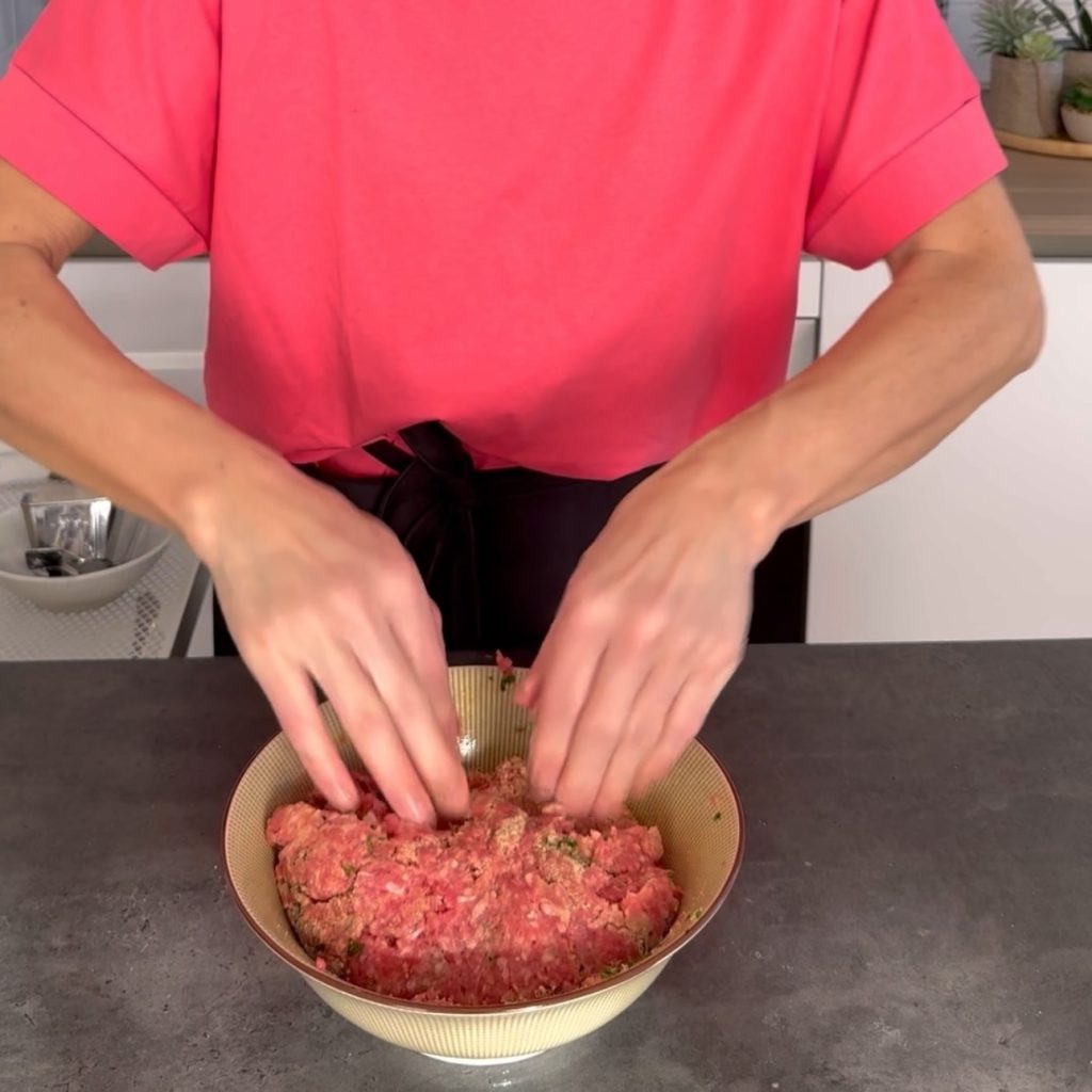meng zodat deze ingrediënten zich met het gehakt vermengen.