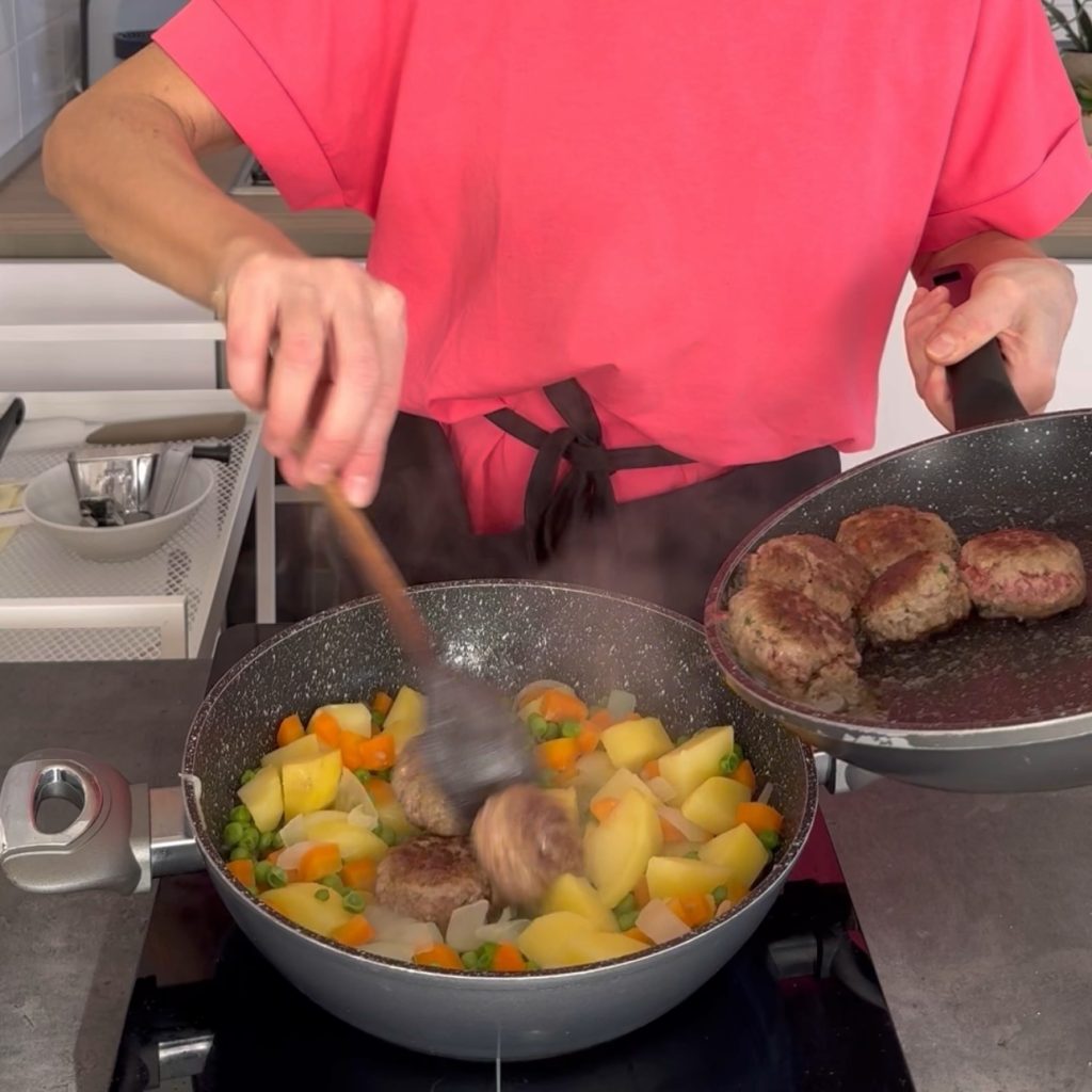 en water of groentebouillon, zet op het vuur en laat de groenten even koken terwijl je de gehaktballen bereidt.