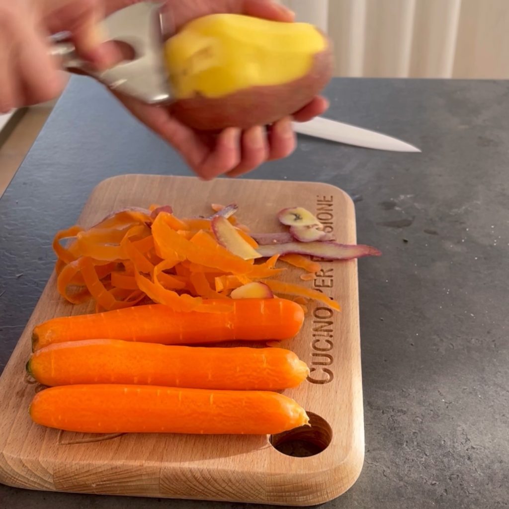 We beginnen met het bereiden van de Gehaktballen met Aardappelen, Wortels en Erwtjes, schil de wortels,