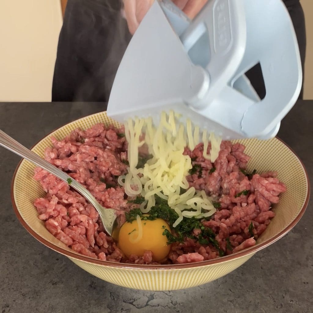 • Doe het gehakt in een kom, werk het met een vork om het los te maken, voeg het ei toe,