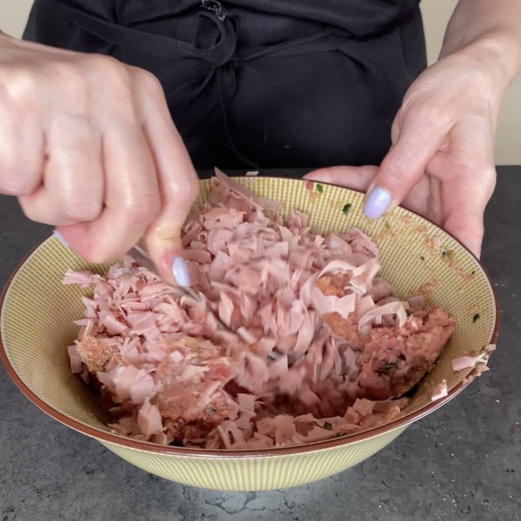 • We beginnen met het bereiden van de gehaktballen met mortadella, hak de mortadella of, als je dat liever hebt, kun je het malen. Ik hou ervan als het wat grover is, dus ik hak het met een mes.
