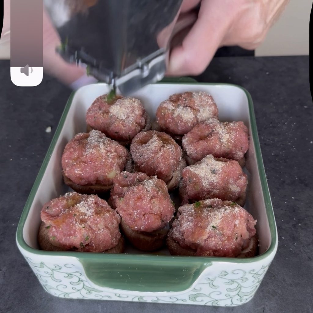 en neem een deel van het mengsel om een gehaktbal te vormen, leg het vlees op elke paddenstoel.