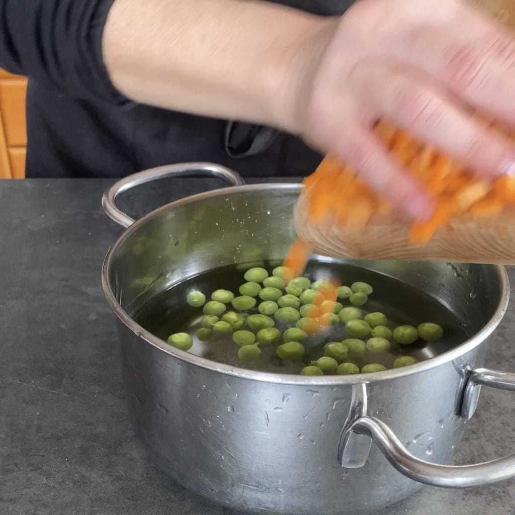 en de wortel in kleine stukjes. Kook gedurende 10 minuten, giet dan af en laat volledig afkoelen.