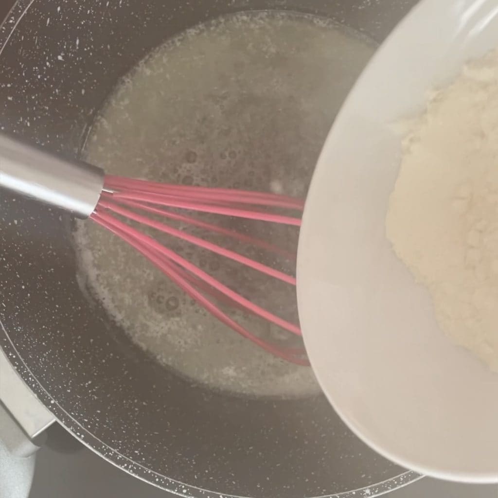 voeg beetje bij beetje de melk toe om klontjes te vermijden en een glad mengsel te krijgen,
