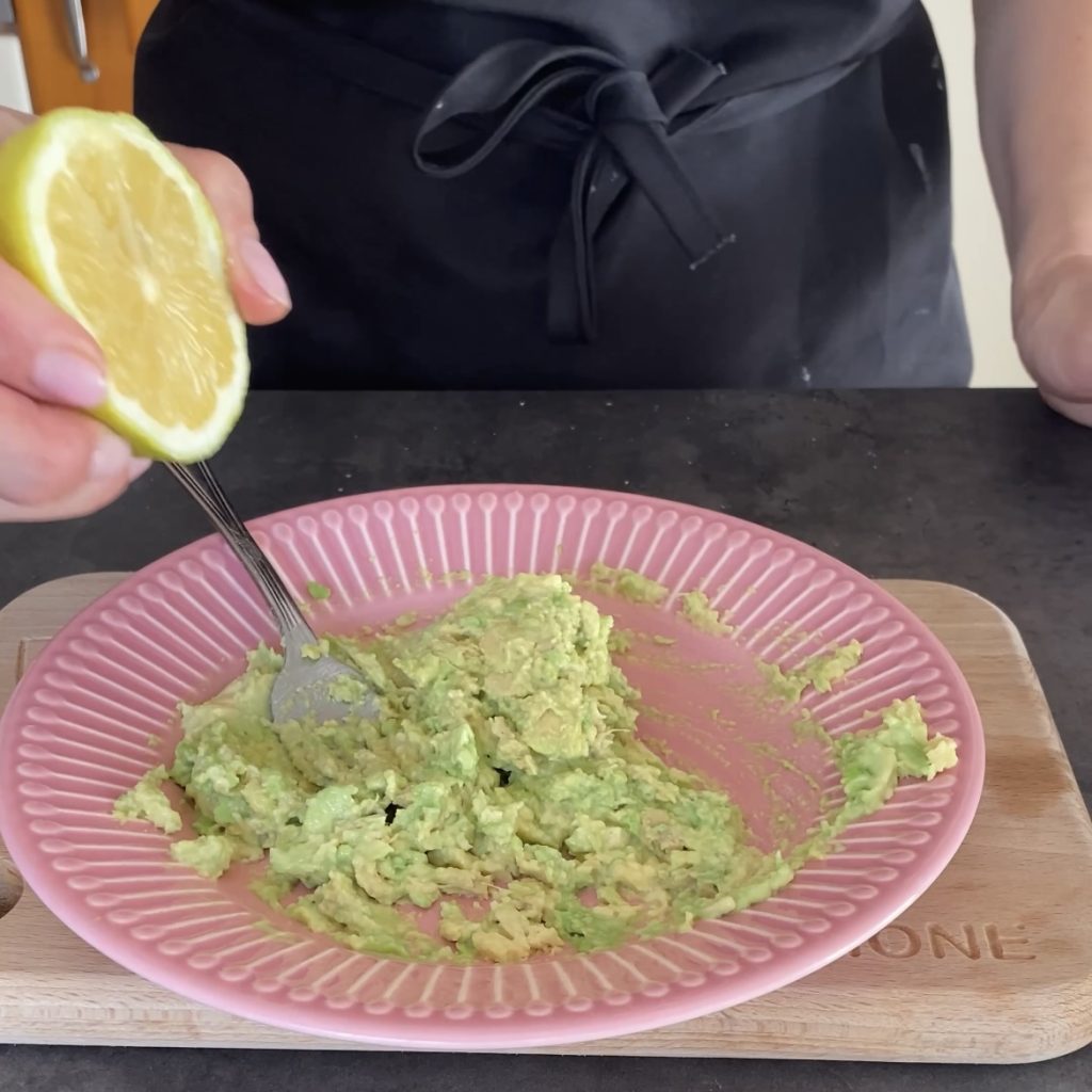 Bereid nu de avocadocrème voor, snijd de avocado doormidden in de lengte, verwijder de pit en haal met een lepel het vruchtvlees eruit, giet het