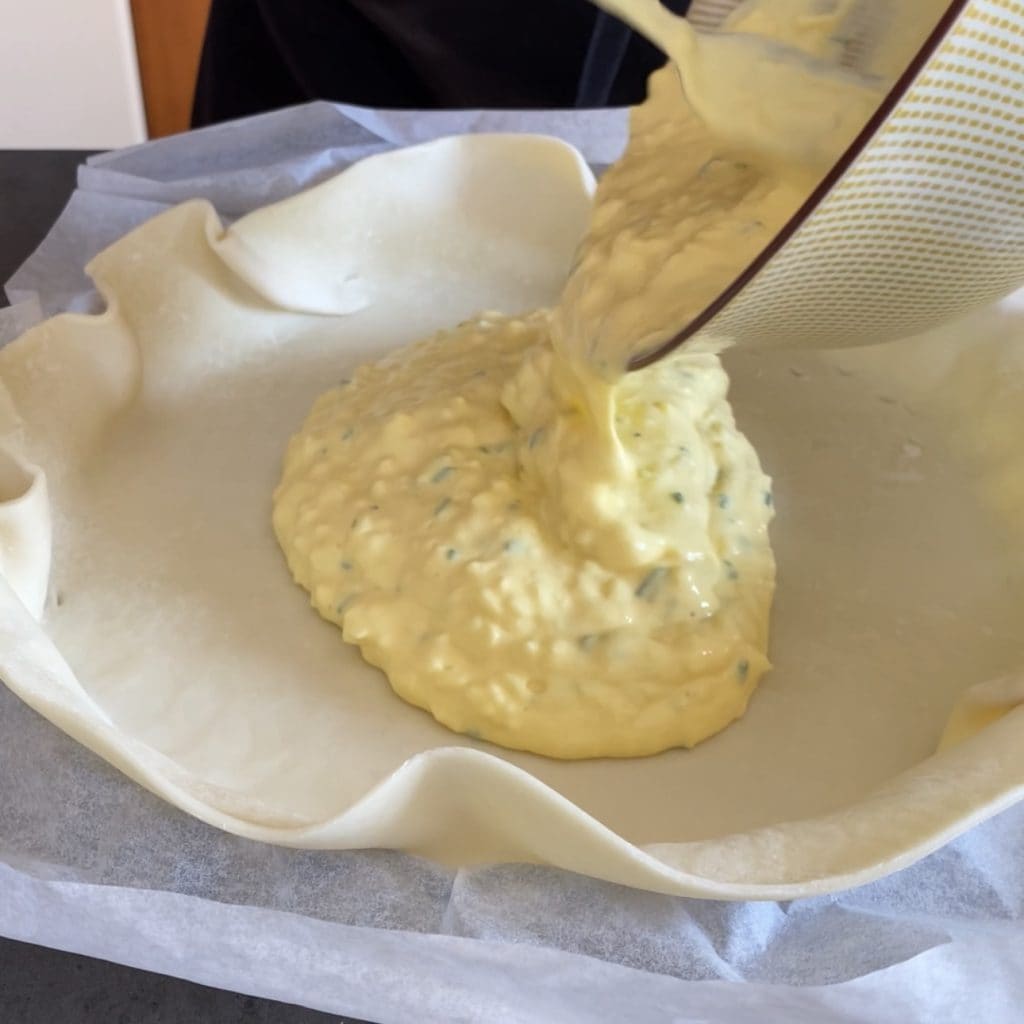 • Rol het bladerdeeg uit en leg het in de bakvorm met bakpapier, giet de ricotta- en eiercrème erin en strijk het glad,