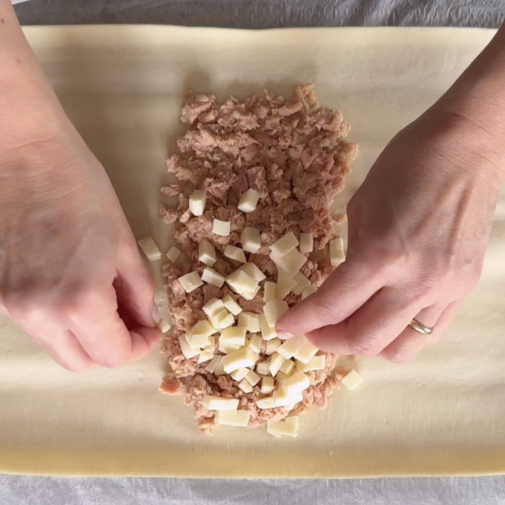 Rol het bladerdeeg uit, leg de lange kant voor je neer en leg de tonijn in het midden.