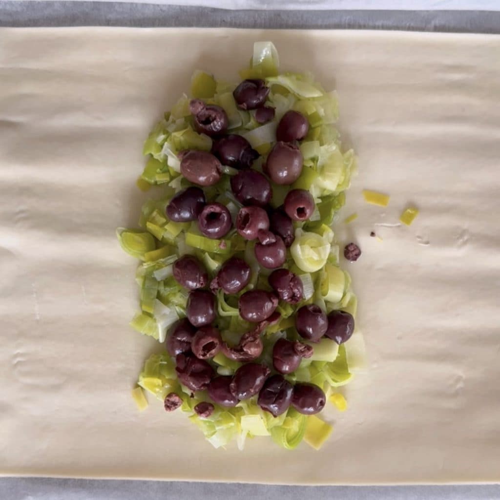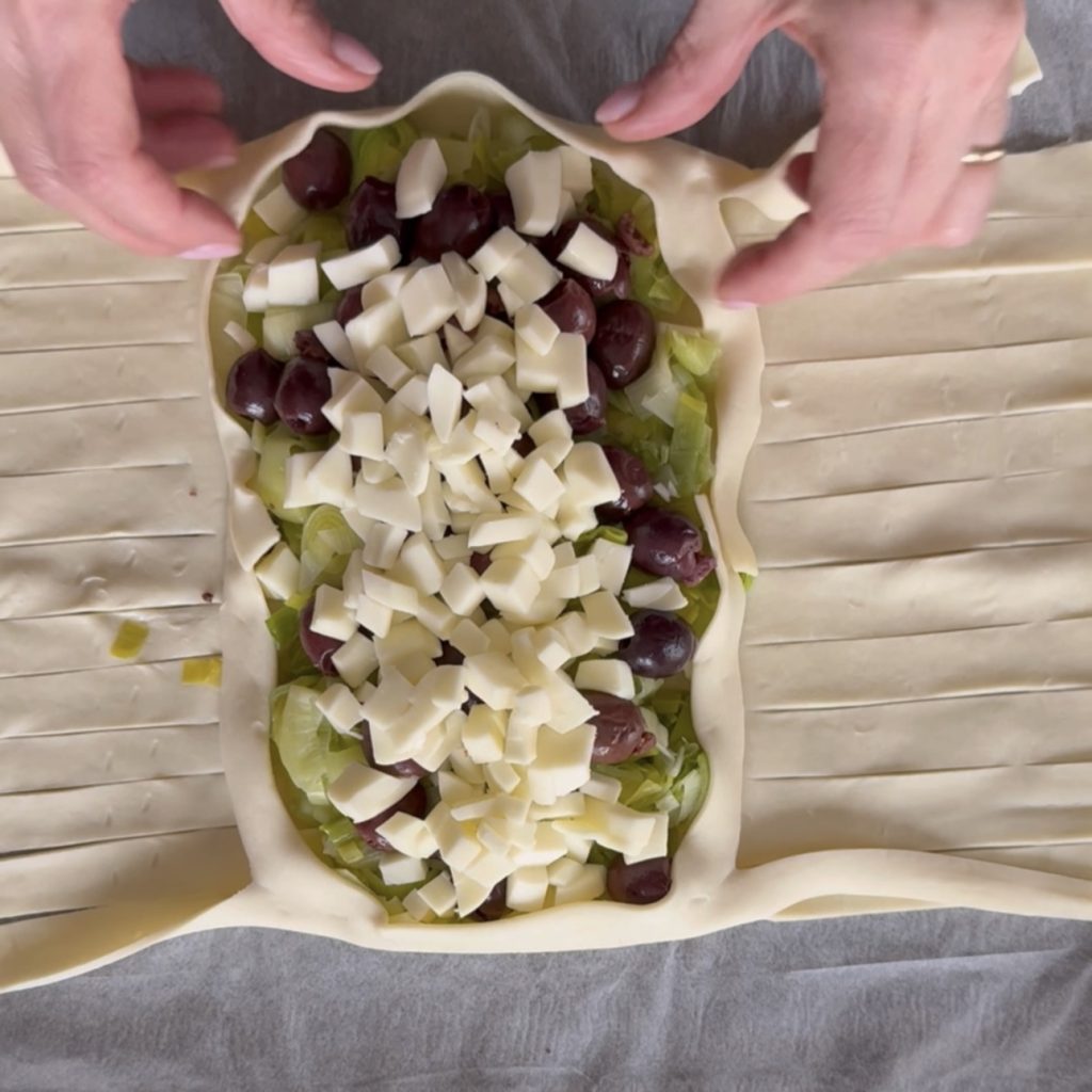 Wanneer de prei klaar is, plaats deze in het midden van het bladerdeeg,