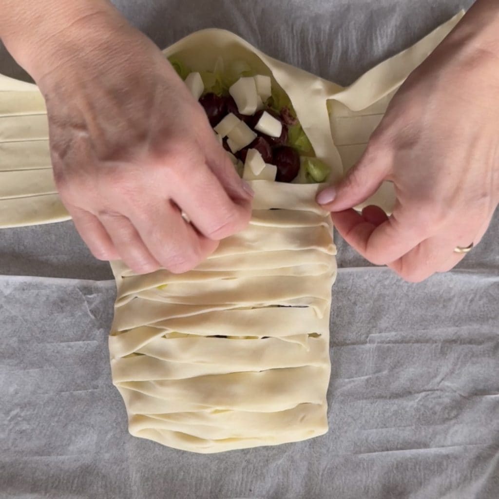 Vlecht de repen in elkaar om de hartige taart goed af te sluiten.
