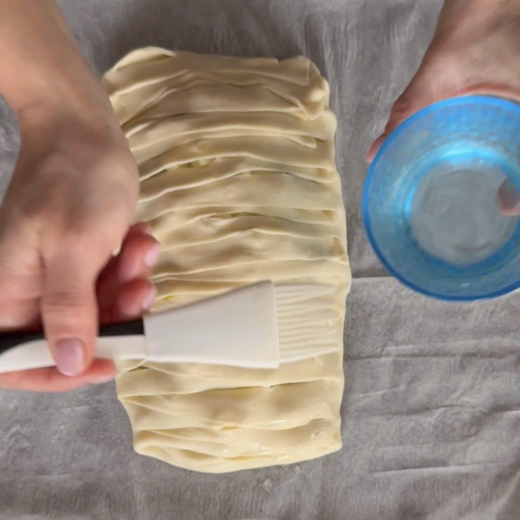 Snijd de twee zijkanten van het bladerdeeg in repen van ongeveer 1 centimeter,