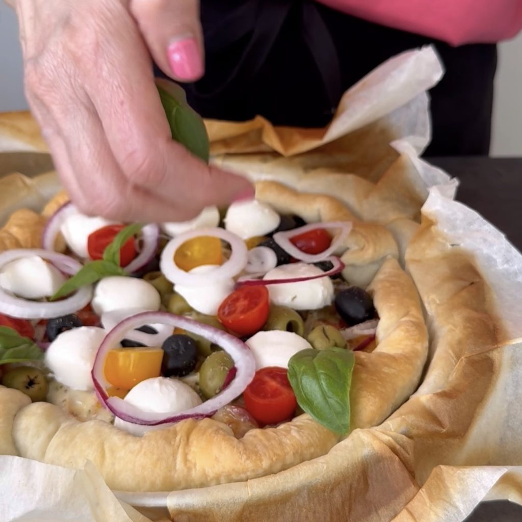 en een paar blaadjes basilicum. Serveer de Hartige taart met tomaatjes en scamorza warm of op kamertemperatuur.