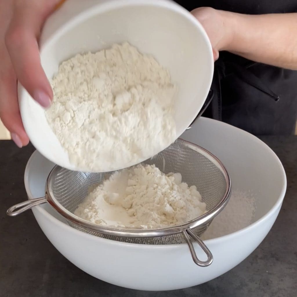 • We beginnen met het maken van de taart met jam en ricotta, zeef de poedersuiker in een kom,