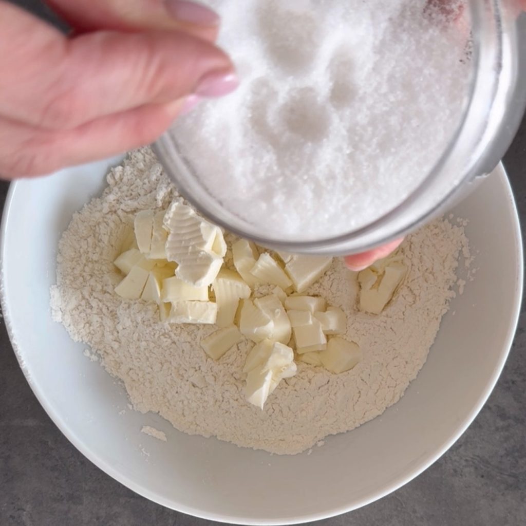 • een theelepel vanille-essence. Werk het geheel totdat een zanderig mengsel ontstaat,