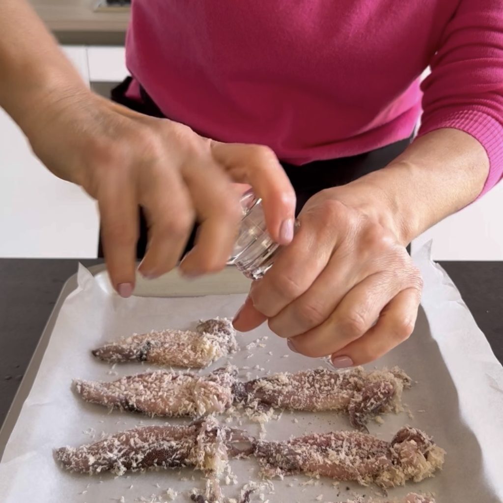 Laten we beginnen met het bereiden van de gegratineerde kalamaren in de oven. Maak de kalamaren schoon van de ingewanden en verwijder het transparante kraakbeen dat in de rug van de kalamar zit; het is eenvoudig te verwijderen door eraan te trekken. Verwijder met een mes de bek en de ogen; deze stap kan de visboer voor je doen als je hier niet ervaren in bent. Was ze daarna goed onder stromend water. Haal de kalamaren door de panko
