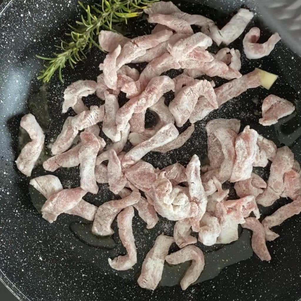 voeg dan de met bloem bedekte kalfsvleesreepjes toe,