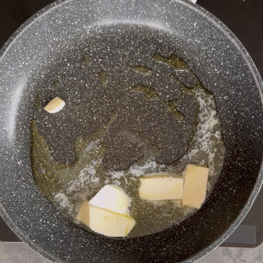 • Giet boter en extra vergine olijfolie in een grote pan, voeg vervolgens de knoflookteen toe