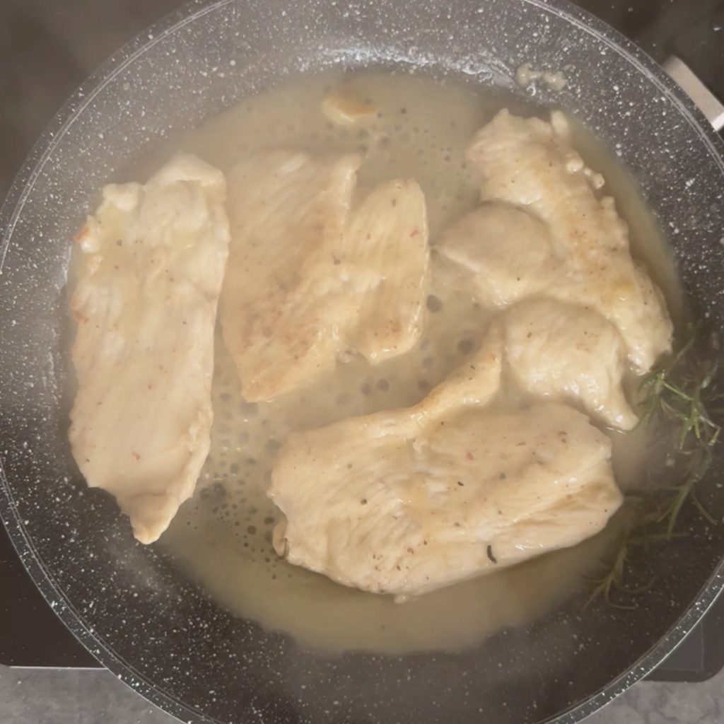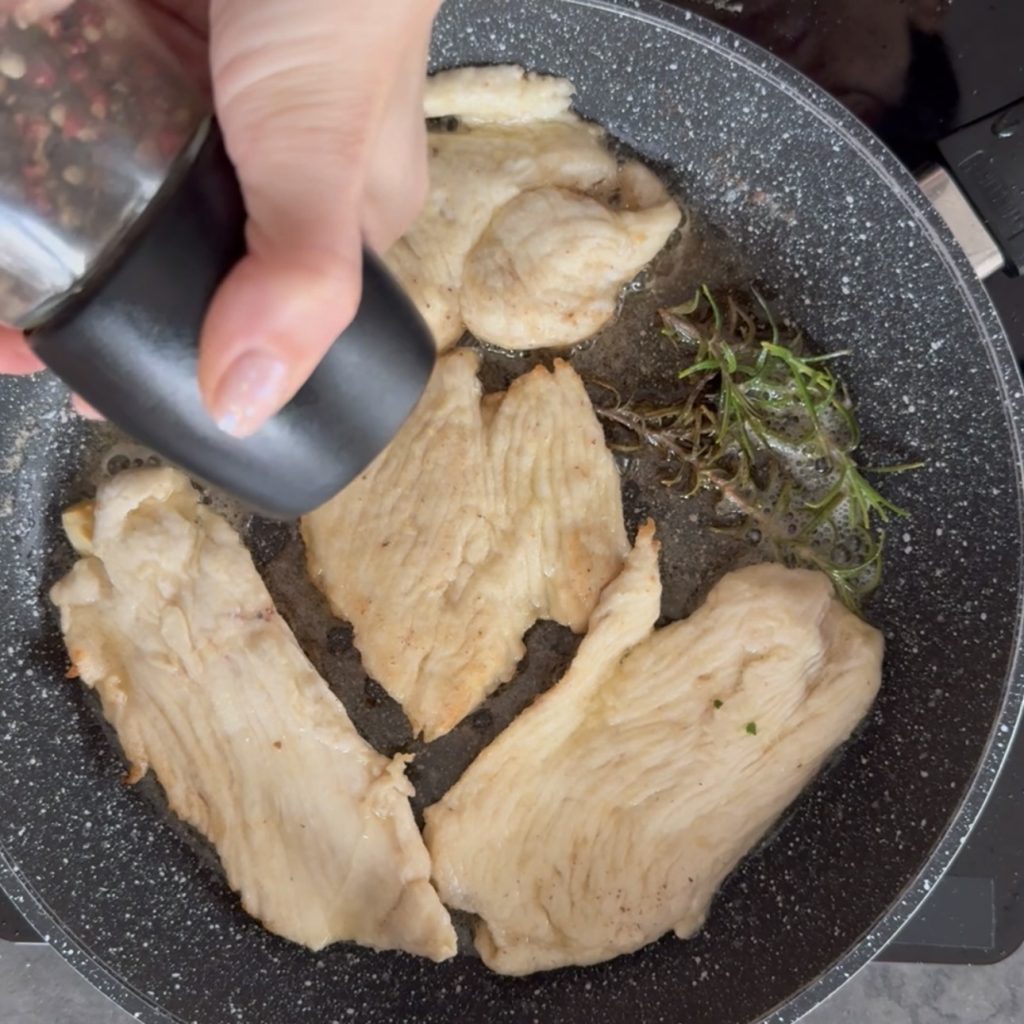 • Laat de boter smelten en laat een paar minuten smaken, voeg dan de eerder bebloemde kalkoen plakjes toe, laat ze