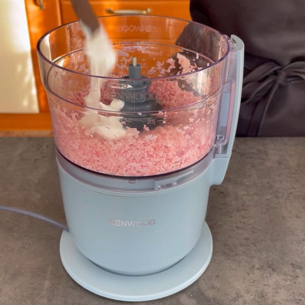 Begin met het bereiden van de Kerst sandwiches met ham, doe de ham in de blenderbeker en mix het,