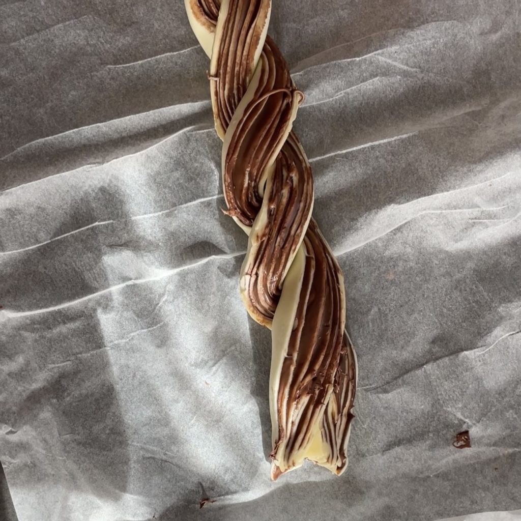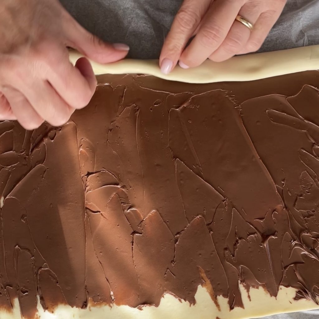 We beginnen met het maken van de Kerstbladerdeegkrans met nutella, rol het bladerdeeg uit en smeer de nutella over het hele bladerdeeg.