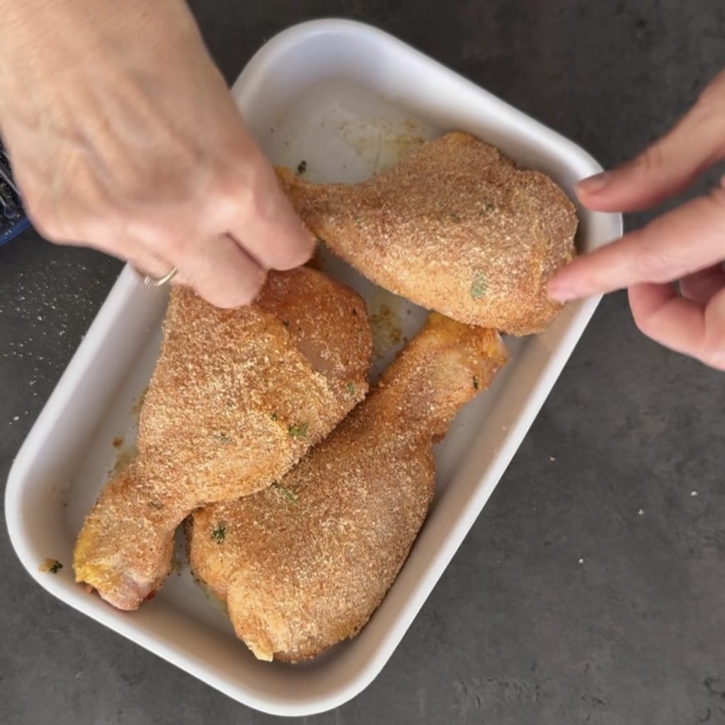 • Giet extra vergine olijfolie over de kipdrumsticks en masseer ze goed in zodat elk deel goed geolied is en