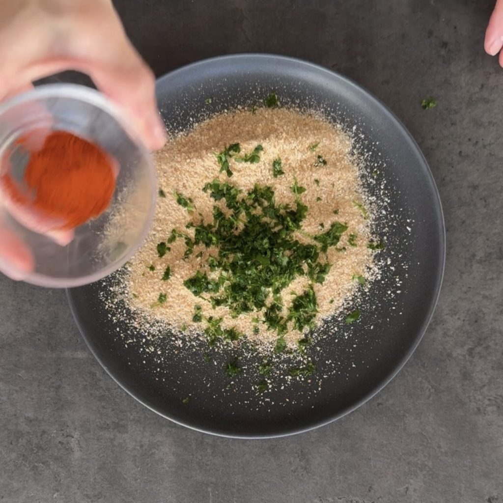 • We beginnen met het bereiden van de Kipdrumsticks met paprika. Giet paneermeel en gehakte peterselie in een bord,