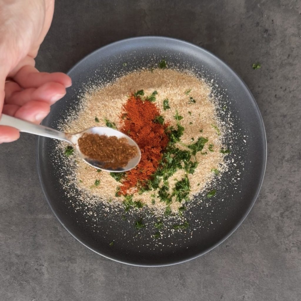 • Giet in een kommetje 2 theelepels paprika en 1 theelepel knoflookpoeder, meng zodat de twee ingrediënten goed vermengen.